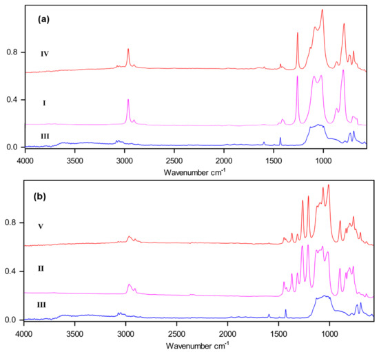 Only in the spectrum of oligomeric III can one observe the absorption of silanol OH-groups at 3500–3200 cm−1 (free and H-bonded groups) [13]. The IR spectra contain the vibrations of C–H, C–C, Si–O, Si–C, and C–F bonds in accordance with common spectroscopic analysis [13].