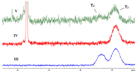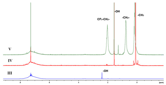 As one can see, these spectra contain not only signals from T3 units (centered at −82 ppm) that correspond to a perfect ladder structure, but also minor signal from −69 to −72 ppm related to T2 units of cage-like structure or silanol fragments [14]. Hence, we certify the structure of block-copolymers IV and V (the chemical shift of fluorine in trifluoromethyl group of V is −65.5 ppm, see Supplementary Materials). The most important result of this study is the fact that the ladder-like block of copolymers contains defects with silanol groups that can result in a decrease of the contact angle, deterioration of mechanical properties, and to an increase of adhesion.