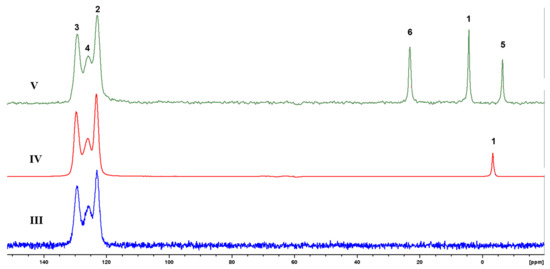As one can see, the spectra of block-copolymers IV and V contain both rigid (broad) and mobile (sharp) parts. The mobile part contains the protons with different resonances which are related not only to the different fragments, but to different mobile phases as well. The exact assignment of these resonances is very complex. The 13C CP/MAS spectra of polymers III–V (Figure 6) indicating fragments with restricted mobility contain the signals from both blocks used at synthesis. Hence, the formal rigid regions contain both ladder and linear units.
