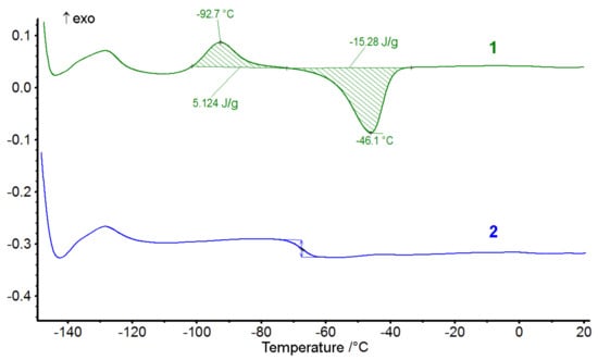 As one can see form DSC curves of block-copolymer IV, it behaves as pure PDMS with Tg about −124 °C, recrystallization at −92.5 °C, and melting at −46 °C [15]. Hence, at such lengths of PDMS blocks, the influence of ladder-like units has not been observed. Similar results was obtained for polymer V with Tg about −67.5 °C.