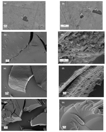 We start this pathway from copolymer IV. The good solubility of this polymer in many solvents limits the possibility for the setup of self-organization. However, we prepared the films from solution in chloroform and recorded their images from the surface and the chip (Figure 10c,d). As one can see, the surface is smooth, but the bulk structure is complex and consists of grains and layers. If the casted copolymer V film was crosslinked from solution in good solvent with respect to one block (butyl acetate), a similar picture (Figure 10e,f) was observed. Thereby, it was shown that the use of selectivity of solvent to any one block of copolymers opens a possibility to manipulate the self-organization of block copolymers. In the case when a solvent is good for both blocks, the situation is much simpler. When the film was crosslinked from such a solvent as hexafluorobenzene, the self-organization was not fixed (Figure 10g,h), and both the surface and chip of films are smooth.