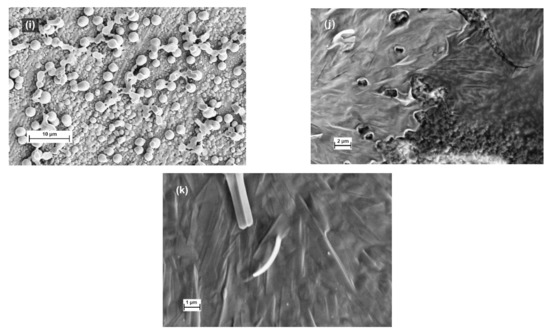 The formation of emulsion (or micellar solution, any kind of latex) presents a new possibility for the manipulation of self-organization. First of all, the crosslinking allows to fix a globular structure which is formed in solution (Figure 10i). Interestingly, at slow drying, such a structure can be transformed in a regular long-strip-like surface (Figure 10j,k). Similar structures have been formed with the preparation of films from latexes of polysiloxane/poly (fluorinated acrylate) block-copolymers [17]. The authors connected the formation of such structures to the core/shell segregation of block copolymers in solution. Hence, in our case, the observed film structures also confirm the segregation of blocks in solution. Thereby, the possibility for the fabrication of well-ordered block copolymer thin films by the variation of solvents used at film casting was demonstrated.