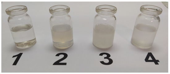 After synthesis, copolymer IV is a white-yellowish powder and copolymer V is white rubber. As one can see from Table 1, the copolymer IV is well soluble in most polar solvents. The behavior of copolymer V is more complex. It can form emulsions in many solvents (Figure 11).