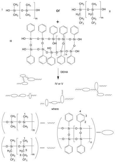 The solvents (toluene, butyl acetate, chloroform, xylene (mixture of isomers), benzene, and tetrahydrofuran (THF)) were purchased from Reachim (Saint Petersburg, Russia), then distillated and purified by standard methods before use. N,N-diethylhydroxylamine (DEHA) was purchased from Shanghai Sunwise Chemical Co., Ltd. (PRC) (Shanghai, China) and used as received unless otherwise stated. Silanol-terminated polydimethylsiloxane (PDMS, I, m = 111, Mn = 8400), polymethyltrifluoropropylsiloxane (PMFS, II, m = 101, Mn = 16,000), and ladder-like polyphenylsiloxane (LAD, III, m = 15, Mn = 3950) were purchased from FGUP NIISK (Saint Petersburg, Russia). Vinyltris(methylethylketoximino)silane (VOS) was supplied by Mitsibishi Chemical Ltd. (Tokyo, Japan).