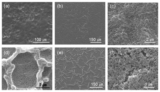 Alternatively, porous LbL films have been employed in the fabrication of superhydrophobic surfaces. For the preparation of porous LbL films, the post-assembly treatment of LbL films built from weak polyelectrolytes has been extensively analyzed. Although the basic treatment [30] and electrochemical methods [31] have been reported, most studies have been focused on the acidic treatment of the LbL films of poly(allylamine hydrochloride) (PAH)/poly(acrylic acid) (PAA) [32,33] or poly(ethyleneimine) (PEI)/PAA [34]. The first superhydrophobic surfaces prepared using the LbL assembly technique were fabricated by a two-stage acid treatment of the PAH/PAA LbL film followed by nanoparticle deposition and silanization [35]. Microscale roughness was obtained from the porous structure, and nanoscale roughness was obtained from the nanoparticles. In another study, a superhydrophobic surface was prepared by the synchronous generation of nano/microscale hierarchical porous structures in the LbL films without nanoparticle deposition using a combination of high-molecular weight (MW) PAH and low-MW PAA with a short deposition time of 1 min [36]. Recently, porous PAH/PAA LbL films were fabricated using the PAA with a bimodal MW distribution [37,38] based on the fact that the porous structure is influenced by the PAA MW in the PAH/PAA LbL film [39,40,41]. It was demonstrated that the surface morphologies and the wetting properties of the porous LbL films could be controlled by adjusting the blend ratio of low- and high-MW PAAs.