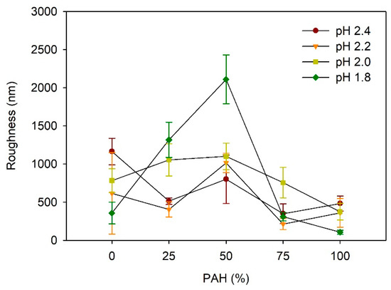 At pH 2.0, the roughness increased slightly from 783 nm to 1100 nm as the PAH ratio increased from 0% to 50%, and it decreased to 375 nm as the PAH ratio increased further to 100%. The samples with 0% and 25% PAH did not exhibit a porous structure, and the higher roughness was attributed to the large-scale irregular surface texture, similar to the images shown in Figure 3a. Contrarily, the samples of 50–100% PAH exhibited relatively low roughness, even though a porous structure or surface texture was observed in the SEM images. As the PAH ratio increased from 50% to 100%, the roughness decreased due to the decrease in the pore size.