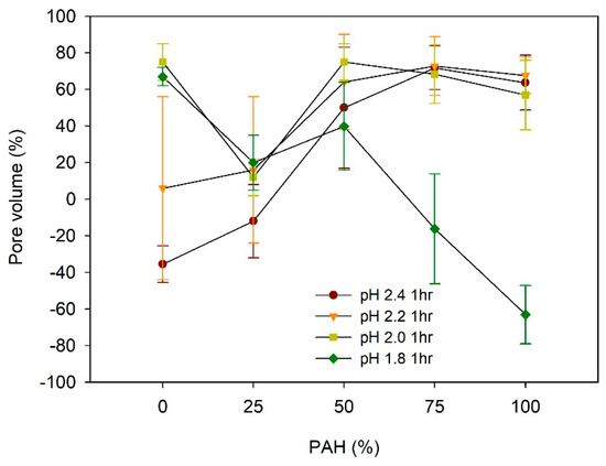 Considering the dependence of the pore volume on the PAH ratio, at pH 2.2–2.4, the pore volume increased with the increase in the PAH ratio from 0% to 50%. However, the pore volume did not vary significantly above a PAH ratio of 50%. Conversely, at pH 1.8, the pore volume decreased with the increase in the PAH ratio.