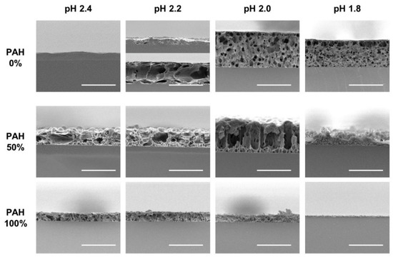To verify the pore structure of the acid-treated films, cross-sections of the selected films were analyzed with SEM (Figure 6). The first row displays the acid-treated films with a 0% PAH ratio. At pH 2.4, the films were partially dissolved without pores in most regions. At pH 2.2, the samples began to show a pore structure; however, it was inhomogeneous. In one region, the film was thin, with a few pores owing to the film dissolution, while in the other region, the film was thick, with large pores. This is because pH 2.2 is the transition pH for the pore formation. At pH 2.0 and 1.8, microporous structure is observed homogeneously beneath the “skin layer”. Contrarily, the 100% PAH films showed a clear pore structure at pH 2.0–2.4, but the pore sizes are smaller than those of the films with 0% PAH. At pH 1.8, the dissolution of the film was observed, as shown in the third row of the figure. Furthermore, the LbL films assembled with a 50% PAH ratio showed larger pore sizes when compared to the films assembled with 0% PAH due to the BPEI blending.