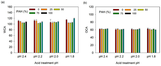 The oil contact angle (OCA) of the LbL films was also analyzed (Figure 7b). In general, the influence of the PAH ratio on the OCA was similar to the result obtained for the WCA. At pH 2.4, the OCA increased from 74° to 94° with an increase in the PAH ratio. At pH 2.2 and 2.0, the OCA was relatively high at the PAH ratios of 50% and 100%. The highest value of the OCA was 108–114° at the PAH ratio of 100%. At pH 1.8, the OCA exhibited the highest value of 114° at a PAH ratio of 50%. Therefore, it was possible to control the WCA and OCA of the film by varying the PAH ratio and the acid treatment pH.