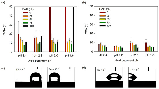 (a) WSA and (b) OSA of lubricant-infused LbL films with various PAH ratios and acid treatment pH values. A WSA of 50° denotes that the water droplet did not slide until the sliding angle increased to 50°. Optical micrographs showing the (c) water and (d) oil droplet sliding as the tilt angle (TA) increases. The lubricant-infused films of (c) pH 2.2, 25% PAH and (d) pH 2.2, PAH 50% were used.
