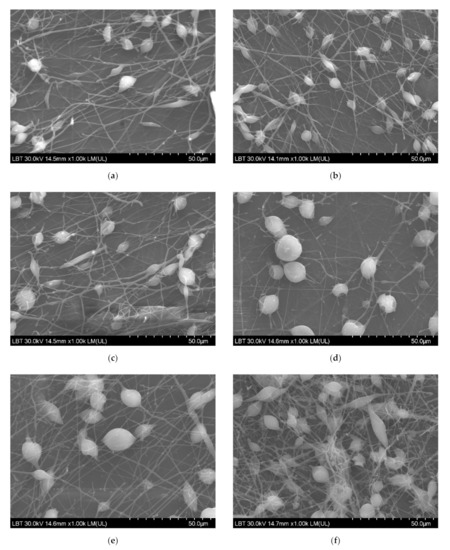 SEM images for PLA/PHBV/ZnO:Fex nanostructures: (a) PLA/PHBV, (b) PLA/PHBV/ZnO:Fe0, (c) PLA/PHBV/ZnO:Fe0.3, (d) PLA/PHBV/ZnO:Fe0.5, (e) PLA/PHBV/ZnO:Fe0.7, and (f) PLA/PHBV/ZnO:Fe1.