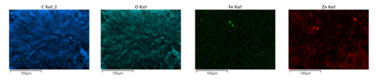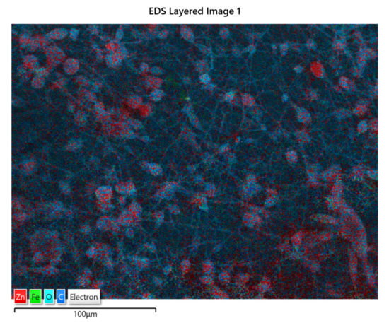 The distribution of ZnO:Fe nanoparticles into the polymer matrix was analyzed by the EDS mapping. As an example, the EDS mapping of PLA/PHBV/ZnO:Fe1% is shown in Figure 5. The mapping indicates the presence of ZnO:Fe nanoparticles within both spheroidal structures and the fibers which connect them. The spheroids are formed around bundles of ZnO:Fe nanoparticles resulting from a non-uniform dispersion in the PHBV solution. Here, ZnO nanoparticles tend to agglomerate as long as their dispersion in the polymer matrix is not stabilized.