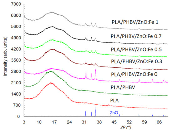 Figure 6 shows the diffraction patterns of ZnO, PLA, PLA/PHBV, and PLA/PHBV/ZnO:Fex composite samples.