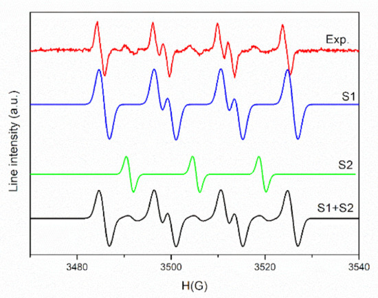 To ensure the origin of these signals, a simulation was performed. The experimental and simulated spectra of PLA/PHBV/ZnO:Fe0.3% in DMSO suspension in the presence of DMPO are shown in Figure 9.