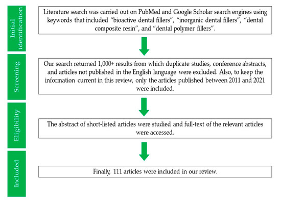 The current review is aimed at summarizing information present in the literature regarding the improvement of the various properties of DAs after the addition of bioactive inorganic fillers. The methodology adapted for this review is presented in Figure 2.
