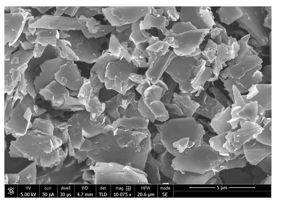 SEM micrograph demonstrating flake-shaped GO particles. Reprinted with permission from Al-Fawaz et al. [54]. Copyright 2020 MDPI.