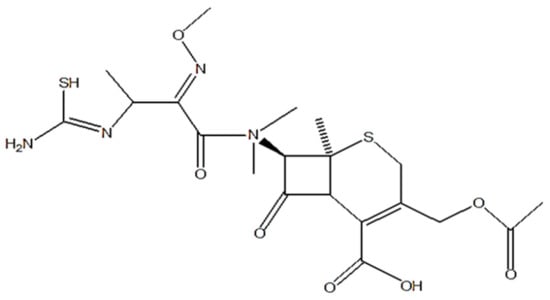Cefotaxime, a third generation semisynthetic cephalosporin, shown in Figure 1, manifests a broad range antibacterial activity against various bacterial strains [14]. Its bactericidal activity is attributed to its high beta lactamase stability, inhibiting the synthesis of the cell wall. Cefotaxime is effectively used against various microbial strains responsible for skin, lower respiratory, urinary tract, intra-abdominal, bone and joint, and CNS infections [15,16]. Thus, it is considered to be an effective antifouling agent for nanoencapsulation with a high in vitro activity, favorable pharmacokinetics, and a moderate molecular weight [17].