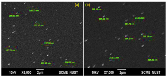 The size of nanoparticles and the morphology of the formulated blank and drug-loaded nano precipitations were characterized through SEM. In Figure 2, SEM images show the spherical morphology of the prepared polymeric nanoparticles with an average size of 200 nm for the blank and 216 nm for the drug-loaded nanoparticles. Uniformity in size and shape of the nanoparticles confirms the absence of coalescence in both blank and drug-loaded nano-precipitations. The marked difference in the size between the blank and drug-loaded polymeric nanoparticles was attributed to the encapsulation of bioactive functional molecules inside the shell of the PCL.