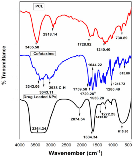 Fourier transform infrared (FTIR) analysis of polycaprolactone, cefotaxime and drug-loaded polymeric NPs.