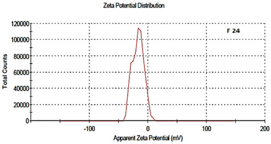 The zeta potential was attributed to the stability of nano-formulation. Large positive and negative magnitudes of charge of the nanoparticles described the high stability in the colloidal system, attributed to the large electrostatic repulsion among them. The optimized blank NPs of PCL showed a zeta potential of −16.8 mV, while drug-loaded nanoparticle showed a potential of −11.1 mV, as shown in Figure 6 and Figure 7. Negative zeta potential was due to the presence of the carbonyl group on the surface of the nanoparticles [34,35]. The zeta potential value of the PCL nanoparticles was found to be affected by the method of preparation, i.e., a decreased magnitude of zeta potential, which has already discussed in the case of the nanoprecipitation technique [36]. Owing to the encapsulation of drug in the PCL shell, a decreased value of zeta potential was attributed to the partial adsorption of cefotaxime on the surface and indicated the entrapment of drug inside the PCL nanoparticle.