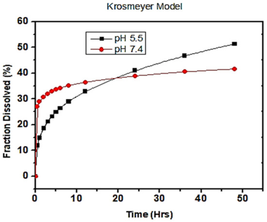 The above-mentioned kinetic models were fitted to study the in vitro drug release mechanism of a given polymeric system as a function of R-squared, a coefficient of determination value. The R-squared value gives a goodness of best fit for linear regression models, ranging from 0 to 1. Here, the in vitro release was experimentally studied at pH values of 5.5 and 7.4, and comparatively exhibited favorable interactions between the drug and the release medium. The data analyzed from these kinetic models revealed that the drug release from both pH values (5.5 and 7.4) followed the Korsmeyer–Peppas model with a maximum linearity of R-squared value, as shown in Figure 9. The diffusion exponent or release exponent (n) value from Korsmeyer–Peppas winds up being 0.318 and 0.094 at pH 5.5 and 7.4, given in Table 2, respectively. The n value gives the best fit data for the drug release which is less than 0.5 shows a Fickian diffusion transport mechanism.