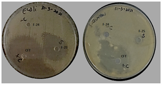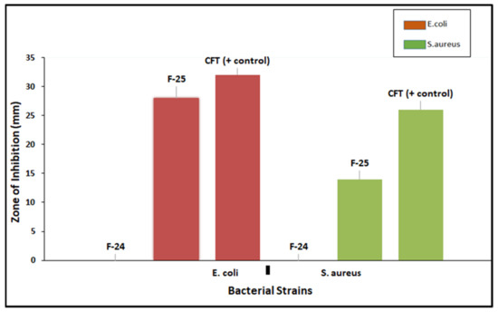 Antibacterial activity of optimized blank NPs (F-24) and drug-loaded NPs (F-25) against two test strains, E. coli and S. aureus, were evaluated using an agar well diffusion assay, as shown in Figure 10. The prominent zone of inhibition was shown against both bacterial strains, including pure drug, cefotaxime, as a positive control, and polymeric nano-encapsulated drug (F-25). No zone of inhibition was shown for the polymeric blank nano-precipitation F-24, as a negative control in both plates against E. coli and S. aureus. Antibacterial activity of F-25 was attributed to the slow and sustained release of drug from NPs from the hydrophobic polymeric shell. The mechanism of bactericidal action was associated with the high beta lactamase stability of cefotaxime which inhibits the growth of the bacterial cell wall [43]. A greater zone of inhibition was shown by F-25 against E. coli compared to S. aureus, which was significant as seen in the graph in Figure 11. The bactericidal action of F-25 was due to the repulsive electrostatic interaction between the Gram negative E. coli and the negatively charged polymeric nanoparticles as compared to the Gram positive S. aureus [44]. Further, E. coli is more susceptible to antifouling polymeric emulsion due to its thin cell walls compared to those of S. aureus [45]. The antibacterial activity of pure drug was higher compared to nano-encapsulated drug NPs (F-25) with a maximum zone of inhibition against both strains. The lesser zone of inhibition of F-25 was attributed to the release kinetics from the nano carriers of drug. Nano encapsulation led to a slow and sustained release of antifouling functionality in 24 h and achieved more favorable pharmacokinetics [46].