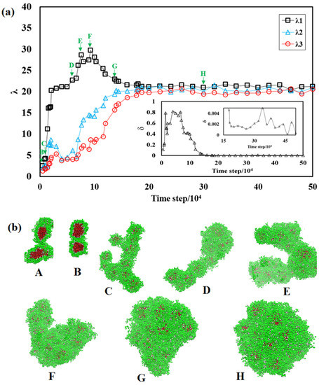 Figure 3a also presents an inset showing the corresponding asphericity, δ. In the beginning of the assembly, δ is close to unity, which matches the corresponding morphologies in Figure 3b. The final equilibrated aggregate is spherical, as shown by δ smaller than 0.01.