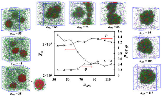 Additionally, the dependence of the aggregate order parameter on aAW is shown in Figure 4. The data show a decreasing trend with decreasing aAW. This is a direct consequence of the increasing compatibility between the solvophobic and solvent beads, which leads to a smaller degree of molecular separation.