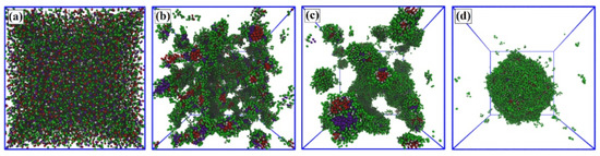 The initially formed small micelles are single-core aggregates with double-core corona structure. They are composed of a solvophobic spherical core of A19, a layer of solvophobic block of the copolymer as the first corona shell, and both a solvophilic block of copolymer and S6 as the second shell. Finally, the small micelles merge with the neighboring micelles to a large spherical aggregate. As shown in Figure 2a–d, the small micelles agglomerate, which is followed by partial merging of their corona regions. However, the small hydrophobic cores remain as separate hydrophobic compartments in the final aggregate. Figure 2e shows a zoomed-in cross-section of the final multicore configuration. Additional time evolution snapshots and a visualization of the aggregate internal structure are provided in the Supplementary Materials Figure S1. Moreover, comparison with the assembly response in the system with the box size of 100Rc × 100Rc × 100Rc (see the Supplementary Materials Figure S2) shows that the simulation box size influences only the aggregate size but not the multicore structure.