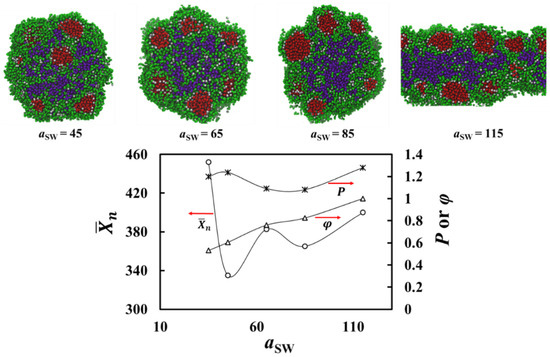 The polydispersity index of the aggregates in Figure 6 remains relatively insensitive to variations of aSW. For the larger aSW values, the increase in the polydispersity index results from the solvophilic homopolymers that remain incompatible with the solvophobic homopolymer aggregating into the aggregate. The presence of the solvophilic polymer in the aggregate imposes constraints, i.e., barriers for solvophobic beads to move in the system randomly and to find other solvophobic beads for favorable like–like interactions. This leads to more variation in the aggregate size.