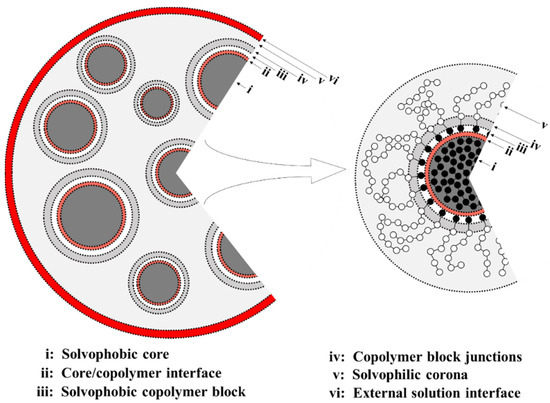 - (ii)–(iii) An interface between the core surface and the solvophobic A blocks of the A1-b-S6 copolymers that surround the cores. Here, the free energy has a positive contribution, for the interface between the solvophobic core and the solvent, and a negative contribution, , resulting from removing core-solvent contacts by the A1-b-S6 copolymers.