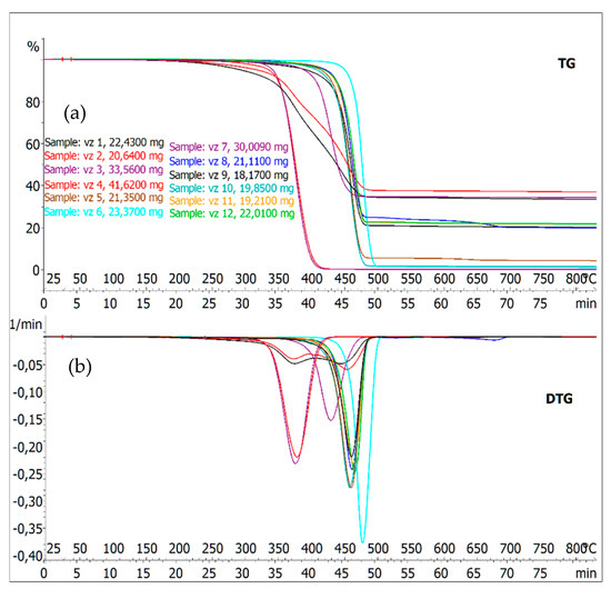 Thermogravimetric analysis (TG) took place in a nitrogen atmosphere (with the nitrogen purity of 3.0 with the flow rate of 50 mL/min−1) with the same method in the case of all samples. The weight of samples ranged between 38.170–41.620 mg. The measurement was carried out at the temperatures ranging between 30–800 °C in three segments. During the first 3 minutes and at the temperature of 30 °C—isothermal segment, the sample was stabilized. Subsequently, the thermodynamic segment continued at the heating speed of 10 °C/min. When the temperature of 800 °C was reached, the measurement was finished with the isothermal segment, and the final temperature of 800 °C was maintained for 3 min.