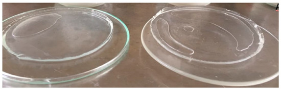 Once the agar and the AAc solution have been irradiated, the agar forms free radicals on hydroxyl groups [31] and interacts with the vinyl group present in AAc to promote polymeric cross-linking. Vinyl groups are the pathway to understanding how AAc can react with itself or even with other compounds due to its high reactivity. Figure 2 illustrates a sample of the obtained hydrogels, which were subjected to swelling, depicting insolubility characteristics. In addition, these hydrogels showed a transparent color. The uniformity was considerable because these hydrogels can increase their volume, even without losing their shape. The toughness and rigidity of the dry and swelling extent of hydrogels depend on the amount of AAc. Adhesivity is a characteristic provided by AAc, present in every sample, even those with a minimum amount of this monomer content.