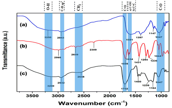 Figure 3 illustrates the characterization by ATR-FTIR, aiming to demonstrate the cross-linking of the hydrogel. Figure 3a shows the ATR-FTIR agar spectrum broadband at 3250 cm−1, corresponding to the O–H stretching mode. At 2943 cm−1, there is a band associated with C–H sp3 stretching vibration. At 1581 cm−1, there is a band corresponding to the C–OH bending. Finally, 1047 cm−1 refers to the C–O bond stretching vibration. Figure 3b shows the AAc ATR-FTIR spectrum broadband that belongs to the hydroxyl group (O–H) overlapping the stretching vibrations sp3 of the C–H bond at 2988 cm−1; the band observed at 2659 cm−1 was associated with the CH2 bending mode. At 1695 cm−1 the signal of carbonyl (C=O) stretching vibration was observed. At 1634 cm−1, a band corresponds to the C=C bending mode [32]; at 1431 cm−1, there is a signal corresponding to the C–H (CH2) bending vibrations. Two bands observed at 1294 and 1236 cm−1 are characteristic of the C–O bond asymmetric and symmetric stretching vibrations of the carboxylic acid. Figure 3c, corresponding to poly(Agar-co-AAc), presented the combination of signals of both raw monomers. The main difference is the absence of a double bond or vinyl group at 1634 cm−1. Thus, it can show the correct functionalization or cross-linking between AAc and agar to form the hydrogel.