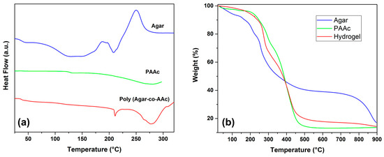 Figure 4a presents the thermal profile of agar, which presented a Tg at 32.9 °C, and a Tm of 207.7 °C; at around 249.5 °C, an exothermic peak was shown, which is associated with the decomposition of the material. Meanwhile, PAAc showed its Tg at 128.8 °C. Finally, the hydrogel (AAc/Agar-30/70, v/v%) presented a Tg at 37.5 °C, as well as two endothermic peaks, one at 211.0 °C and the other at 278.1 °C. The signals noticed at 37.5 °C and 278 °C are due to the presence of PAAc on the copolymer; meanwhile, the peak observed at 211 °C belongs to agar; this thermal profile displays the behavior of a new polymeric system, which demonstrates the combination of both polymers. Additionally, the hydrogel exhibited an enhancement in thermal resistance compared to agar, since no exothermic signals were observed for this sample.