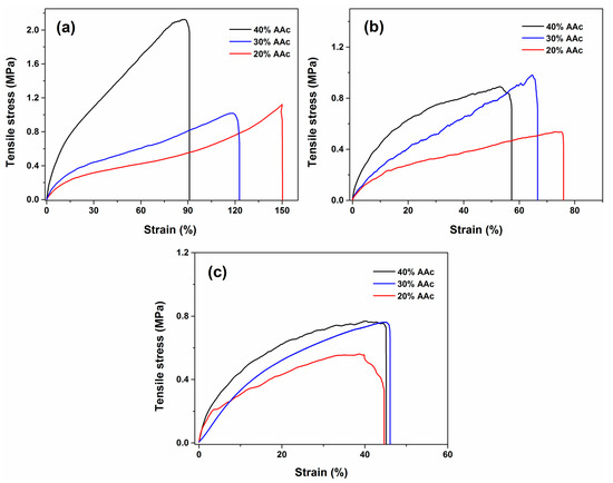 Mechanical properties of poly(Agar AAc) samples at a proportion of AAc/Agar at 20/80, 30/70, 40/60 (v/v%) irradiated with: (a) 15 kGy, (b) 20 kGy, and (c) 25 kGy. Representative curves of each sample were obtained from measurements carried out in triplicate.