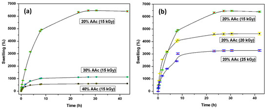 Compared with the hydrophilic groups present in AAc, it promptly forms hydrogen bonds with the surrounding environment. Therefore, when the hydrogel is exposed to high radiation doses, the degree of cross-linking between chains increases, which is inversely proportional to the water absorption capacity. As the radiation dose increases, more connection points are created in the structure, resulting in a compact system. According to Figure 6b, the sample’s water absorption rate irradiated with 15 kGy is close to 6500%, while the poly(Agar-co-AAc) structure, irradiated with 25 kGy, absorbs 3000% of water. Hydrogels’ high water uptake capacity would benefit injured or burned skin since these kinds of injuries are known for losing plenty of liquids.