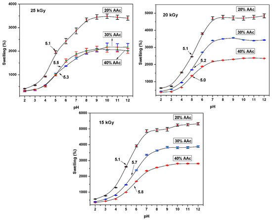 The primary goal of these studies was to evaluate the effects of different monomeric mixtures on the physicochemical behavior of the system in simulated physiological fluids such as pH. The hydrogels presented a great uptake capacity of PBS because of ions in the buffer solutions, and hydrogels kept their strength and structure. Samples performed some assays at monomer concentrations of AAc/Agar (20/80, 30/70, and 40/60; v/v%) and applied doses (15, 20, and 25 kGy). The swelling degree increased proportionally to the agar content in the copolymers. This is because hydrogels with high agar content show more hydrophilic groups readily to form bonds.