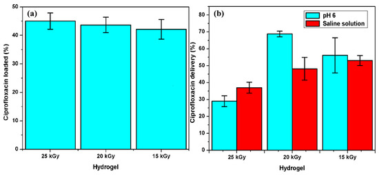 Hydrogels (AAc/Agar-30/70 v/v%) were immersed in 0.012 mg/mL ciprofloxacin solutions. The samples presented a significant drug adsorption capacity. It was noticed that all the hydrogels presented a good affinity to the drug; the loading efficiency increased as a function of the applied dose. This point of view could be explained by the cross-linking degree since, at higher doses, a greater number of covalent bonds can be formed; that means that the closeness between hydrophilic groups helps to retain the drug (Figure 8a). Since the number of carboxylic groups present was almost the same for three cases, the acrylic acid was 30% of the volume for all samples. Besides, the ciprofloxacin has a positive charge (due to the protonation of the amine group) [38], which favors the intermolecular interactions between the carboxyl group and the drug, resulting in a loading efficiency of about 40–45%.