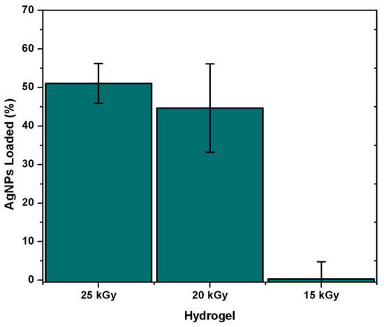 Poly(Agar-co-AAc) hydrogels (30/70, v/v%) were immersed in AgNPs suspensions of 0.0784 mg/mL. The absorbance of the suspension was constantly monitored to determine the equilibrium time of absorption. The groups that present the ability to host the metallic nanoparticles are the hydroxyl and carbonyl groups present in the hydrogel, which interact with AgNPs through electrostatic interaction. Figure 9 showed an important dependence based on radiation dose. Samples irradiated at 15 kGy did not present affinity for AgNPs even after 45 h of immersion. This sample just absorbed the solution, but the solution’s absorbance did not display a notable decrease; this means that the AgNPs need a more compact structure to be retained in it. On the other side, the hydrogel synthesized with 20 kGy presented a remarkable load capacity; because of its greater cross-linking extent, this capacity was more prominent for the hydrogel obtained at 25 kGy; this sample presented the highest load efficiency, which was close to 50%. This sample displayed the highest load ability since it had a more compact structure, and the hydrophilic groups easily encircled the metallic nanoparticle due to the proximity among them.