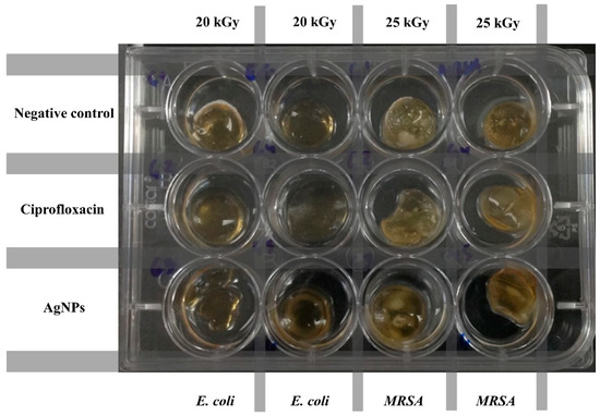 The antimicrobial assay of hydrogels was carried out in a solution infused with E. coli and S. aureus (Figure 10). A hydrogel without antibiotics was used as a negative control. Ciprofloxacin was used as a drug model since it has excellent antibacterial activity against a wide spectrum of Gram-positive and Gram-negative microorganisms [40]. Ciprofloxacin has similar activity against all Staphylococci [41]. Meanwhile, AgNPs are capable of attacking and eliminating some Gram-negative (E. coli, Pseudomonas aeruginosa and Salmonella enterica) and Gram-positive microorganisms (S. aureus and Bacillus subtilis) [42].