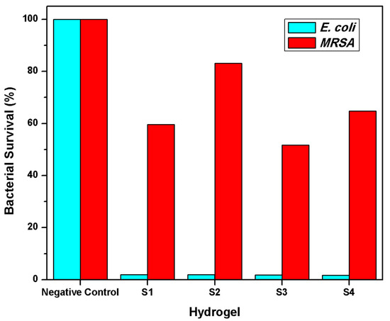 Figure 11 shows the negative control, which showed 100% of bacterial survival since this sample did not contain an antimicrobial agent. The S1 and S2 are ciprofloxacin–loaded-hydrogels AAc/Agar (30/70, v/v%), irradiated at 25 and 20 kGy. On the other side, the S3 and S4 are samples loaded with AgNPs (AAc/Agar: 30/70 v/v%) at different irradiation doses. All samples displayed an excellent biocidal activity against E. coli since they reduced about 98% of the count on both ciprofloxacin and AgNPs loaded hydrogels. However, the efficacy when tested against S. aureus was notably lower than exhibited for E. coli. The mechanism of ciprofloxacin and other quinolones involves inhibiting bacterial DNA gyrase [43], thus reducing bacterial activity. The samples S1 and S3 exhibited a better performance in eradicating the S. aureus than the S2 and S4 samples independently of the biocidal agent; this is because S1 and S3 had a minor cross-linking extent and, therefore, release more drug and were more active against the bacteria. On the other side, the samples loaded with silver nanoparticles exhibited a higher bacterial killing percentage compared to hydrogels loaded with ciprofloxacin obtained at the same irradiation doses, respectively. In summary, the samples exhibited better antimicrobial activity against E. coli than MRSA, independently of the amount of loaded drug and biocidal agent. The lower biocidal efficacy observed for MRSA is because Gram-positive bacteria have a thicker cell wall, which makes them less susceptible to ciprofloxacin.