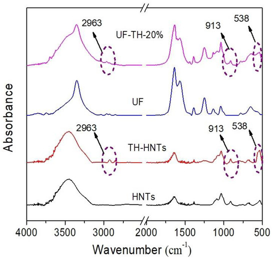 Figure 1 showed the FTIR spectra of HNTs, TH-HNTs, UF, and UF-TH-20%. According to Figure 1, the bands at 913 cm−1 and 538 cm−1 were attributed to Al–O–OH vibration and Al–O–Si vibration of the halloysite. It could be found that there was a new peak at 2963 cm−1 in the spectra of TH-HNTs compared to that of HNTs. This peak was attributed to C–H stretching vibration of couple agent. This phenomenon showed that the couple agent was grafted on HNTs [43,59]. According to Figure 1, the peaks at 3350 cm−1 and 1637 cm−1 were attributed to the N-H stretching vibration and C=O stretching vibration, the peak at 1569 cm−1 was ascribed to the N–H bending vibration, and the band at 1248 cm−1 was corresponding to the C–O stretching vibration. The peak at 1030 cm−1 is the characteristic stretching vibration of C–N groups in the UF. It is noted that there were three new bands at 2963 cm−1, 913 cm−1, and 538 cm−1 in the FTIR spectra of UF-TH-20%. These bands were corresponding to those of TH-HNTs. It could be noted that the band at 3350 cm−1 became wide, which could be affected by the chemical or physical interaction between the UF and TH-HNTs.