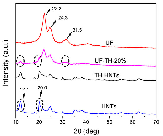 XRD diffraction patterns of HNTs, TH-HNTs, UF, and UF-TH-20%.