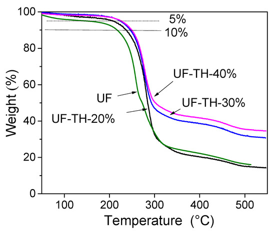 It could be seen that the temperature at 5% weight loss of UF-TH-20%, UF-TH-30%, and UF-TH-40% was 207.8 °C, 222.3 °C, and 225.2 °C, respectively. The temperature increased by 51.9 °C, 66.4 °C, and 69.3 °C compared to the 5% weight loss temperature 155.9 °C of UF. At the same time, the temperature at 10% weight loss of UF-TH-20%, UF-TH-30%, and UF-TH-40% was 236.8 °C, 247.0 °C and 252.3 °C, respectively. The temperature increased by 18.8 °C, 29.0 °C, and 34.3 °C compared to the 10% weight loss temperature 218.0 °C of UF. The result showed that UF/TH-HNTs nanocomposites had better stability.