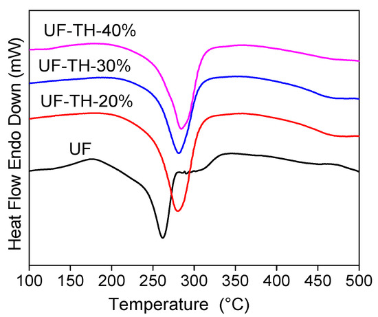 Figure 5 showed the DTA curves of UF and UF/HNTs nanocomposites. When the temperature was above 200 °C, the polymer chain began to be broken. The largest endothermic peak was attributed to degradation of polymer backbone. According to Figure 5, the peak temperature of UF-TH-20%, UF-TH-30%, and UF-TH-40% was 279.2 °C, 281.9 °C, and 284.7 °C, respectively, which was higher than that of UF. The peak temperature of UF was only 261.9 °C. The result showed that the polymer backbone of nanocomposites needed more energy to be destroyed. The reason is as follows: firstly, the TH-HNTs could be dispersed in UF more uniformly and the TH-HNTs were surrounded with UF. The structure of nanocomposites became more compact owing to the hydrogen bond between amino groups of the TH-HNTs and those of UF; secondly, the amino groups of the TH-HNTs could make the chemical reaction with the hydroxyl groups of the UF, thus the cross-linked network formed. The compatible interface between the TH-HNTs and UF occurred. The peak temperatures increased with the addition of the TH-HNTs, showing that the nanocomposites had stronger stability. The result of DTA was consistent to that of TGA.