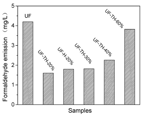 Figure 6 showed formaldehyde emission of plywood samples with the addition of UF nanocomposites. According to Figure 6, UF nanocomposites could effectively decrease the formaldehyde emission of the UF adhesive. After adding the UF-TH-20% to the adhesive, the emission reduced to 1.60 mg/L from 4.20 mg/L. The reason is as follows: firstly, the TH-HNTs could adsorb effectively the formaldehyde; secondly, cross-linking network of the UF nanocomposites could prevent the formaldehyde escaping from the polymer; and thirdly, structural stability of the network became stronger, and the polymer chain could not easily be broken to emit formaldehyde [43]. Compared to the pristine HNTs, the TH-HNTs could more effectively decrease the formaldehyde emission. Meanwhile, it could be noted that the formaldehyde emission was the least when the UF-TH-20% was used. The possible reason was as follows: when the content was 20%, the particles were dispersed averagely in the solution and it was easy to be modified. When the content was too high, above 20%, it was more difficult for the particles to be dispersed in the solution. Thus, it was hard to be modified by the coupling agent. The modified particles had worse compatibility with the polymer. There were more large aggregates, and the hindering effect on the molecular movement was strong. The monomer and short polymer chain could difficultly meet each other to make the reaction. It was hard to prolong the polymer chain. The crosslinking degree of the polymer resin decreased, and the structural stability of the network became weaker, so it was easier for the polymer chain to be degraded and the formaldehyde to be released.