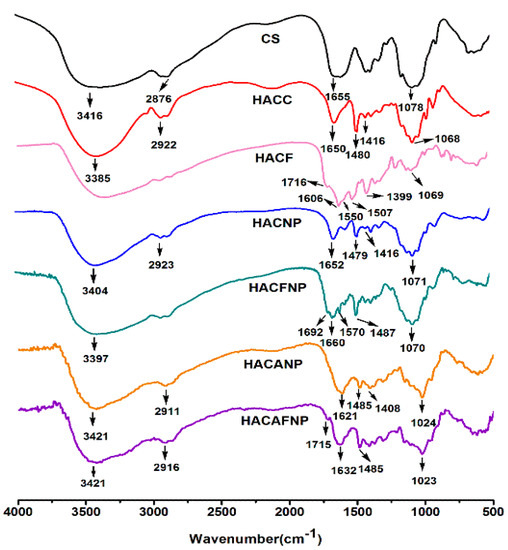 FTIR spectra of chitosan, chitosan derivatives, and chitosan nanoparticles. CS: chitosan, HACC: 2-hydroxypropyltrimethyl ammonium chloride chitosan, HACF: 2-hydroxypropyltrimethyl ammonium chloride chitosan grafting folic acid, HACNP: Nanoparticles based on 2-hydroxypropyltrimethyl ammonium chloride chitosan, HACFNP: Nanoparticles based on 2-hydroxypropyltrimethyl ammonium chloride chitosan grafting folic acid, HACANP: Nanoparticles loading ADM based on 2-hydroxypropyltrimethyl ammonium chloride chitosan, HACAFNP: Nanoparticles loading ADM based on 2-hydroxypropyltrimethyl ammonium chloride chitosan grafting folic acid.