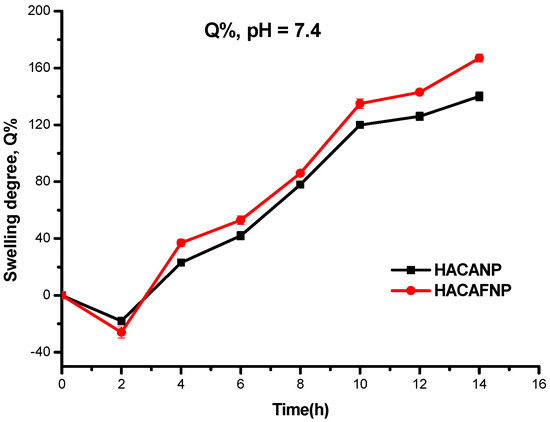 It has been reported that swelling degree is essential for chitosan nanoparticles. This is because chitosan nanoparticles with good swelling degree will facilitate more or less the release of ADM from the hydrogel matrix. From Figure 5, for HACAFNP, during the first 2 h, the swelling degree was negative because a part of the samples dissolved when the samples swelled in the swelling agent. In the later 10 h, the swelling degree was positive, and the swelling degree increased quickly. In other words, the porosity of chitosan nanoparticles increased with passage of time. With the increase of porosity of chitosan nanoparticles, the ADM in the nanoparticle was diffused through the pores of the nanoparticles.