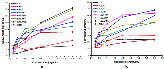 Oxidative stress is a pathological state due to the imbalance between oxidants and antioxidants, which can result in many diseases such as neurodegenerative disease, cancer, cardiovascular disease, and so on [35]. Therefore, it is very important for drug carriers to have good antioxidant activity. In this study, two antioxidant activities, including superoxide radical scavenging activity and the DPPH radical scavenging ability of chitosan, chitosan derivatives, and chitosan nanoparticles, were evaluated in vitro. The superoxide radical scavenging activity of tested samples is shown in Figure 7a. From the figure, several conclusions can be found as follows: firstly, chitosan and HACC have poor superoxide radical scavenging activity, with scavenging effects of 15.19% and 23.50% when the concentration was 1.6 mg/mL. However, after the introduction of folic acid via ion exchange, the HACF showed an enhanced superoxide radical scavenging activity of 51.23% with a concentration of 1.6 mg/mL. For all samples to be measured, the sample concentrations were positively correlated with clearance of the superoxide radical scavenging activity. Taking CS as an example, the scavenging effects were 3.19, 3.59, 7.43, 12.85, and 15.19% when the sample concentrations were 0.1, 0.2, 0.4, 0.8, and 1.6 mg/mL, respectively. Finally, the decreased superoxide radical scavenging activities were found for HACAFNP, HACANP, HACFNP, HACF, ADM, HACC, and CS with values of 72.44, 69.50, 58.65, 51.23, 44.56, 23.50, and 15.19%, respectively. The DPPH radical scavenging activity of chitosan, chitosan derivatives and chitosan nanoparticles with different concentrations are shown in Figure 7b. From Figure 7b, a growing tendency is found for CS, ADM, HACC, HACNP, HACANP, HACF, HACFNP, and HACAFNP with DPPH radical scavenging abilities of 68.29, 63.54, 60.03, 50.12, 49.44, 30.15, 24.14, and 23.54% when the concentration was 1.6 mg/mL. It is critical for nanomaterials with good biological activity to avoid infection and immunoreaction [21,31]. Based on the above analyses from Figure 7, HACANP and HACAFNP with enhanced radical scavenging activity may inhibit the lipid peroxidation inside the cell and serve as a practical drug carrier.